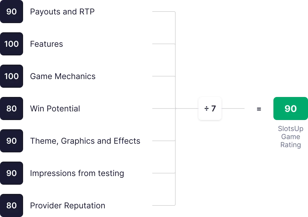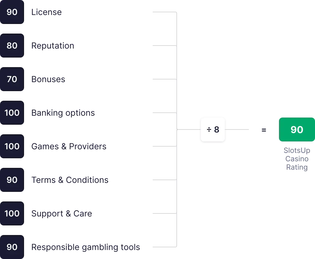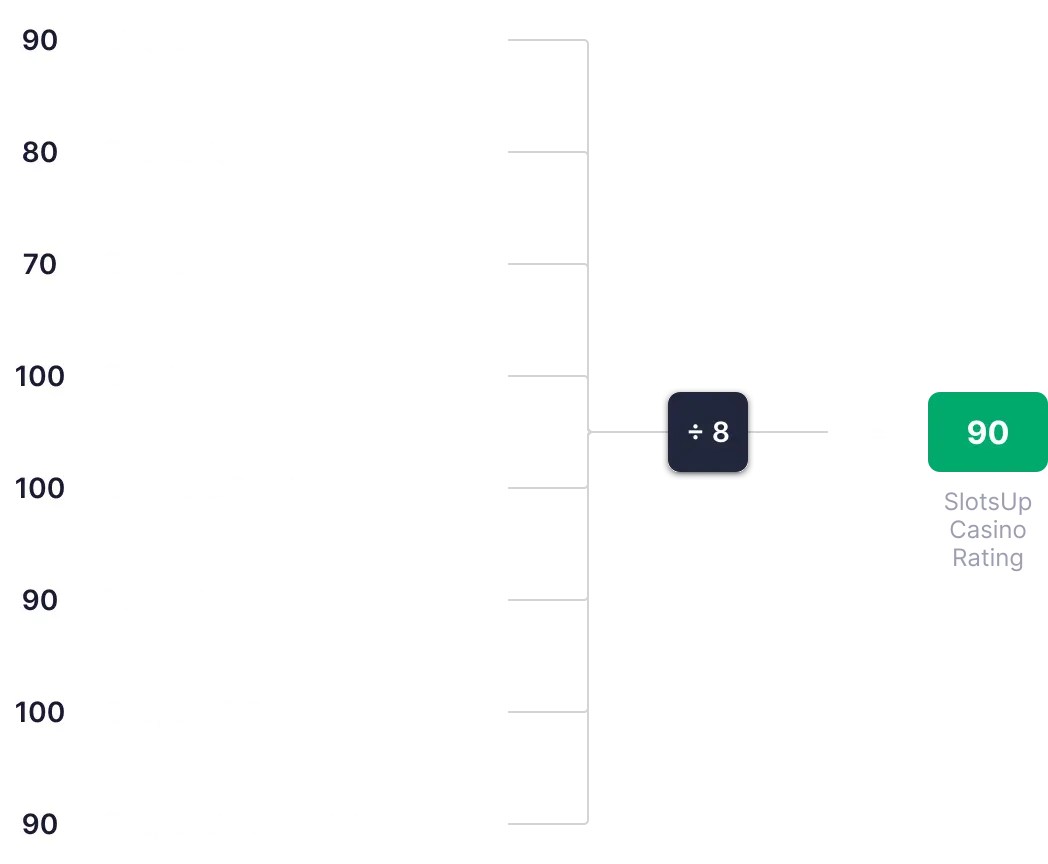 SlotsUp カジノ評価は、8つの主要指標に基づいており、それぞれが0〜100点で採点されます。これらのスコアを合計・平均して、最終的な総合評価を決定します。