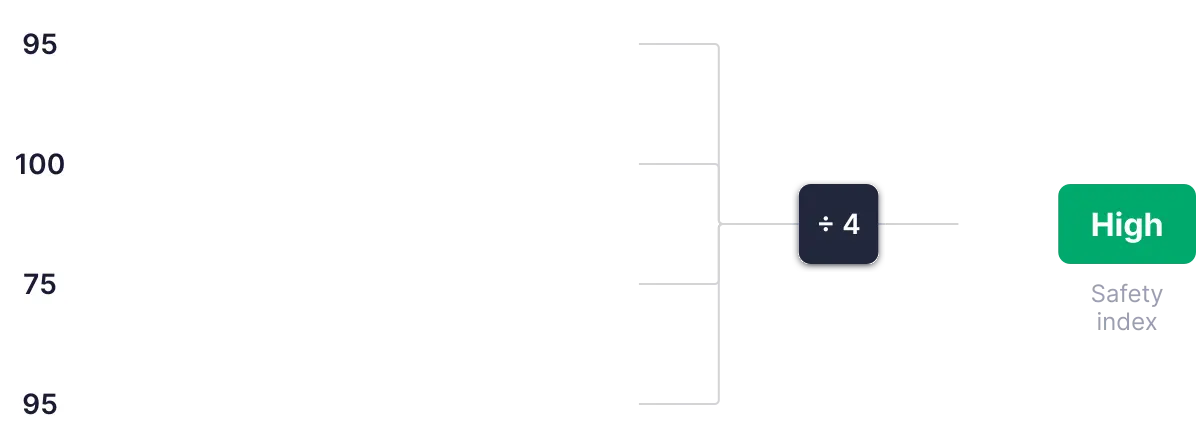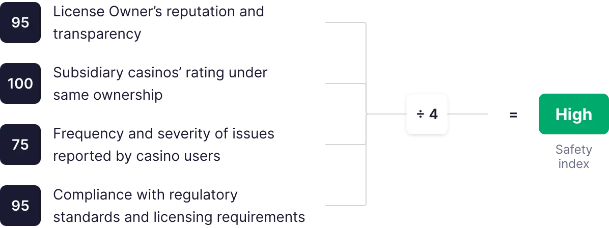 カジノの安全性は、4つの基準(個別2項目+関連性のある2項目)に基づいて評価されます。それぞれ0〜100点で採点され、その合計と平均により最終的なセーフティインデックスが決定されます。