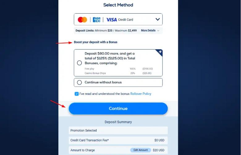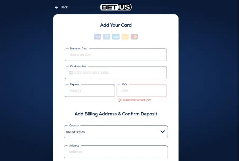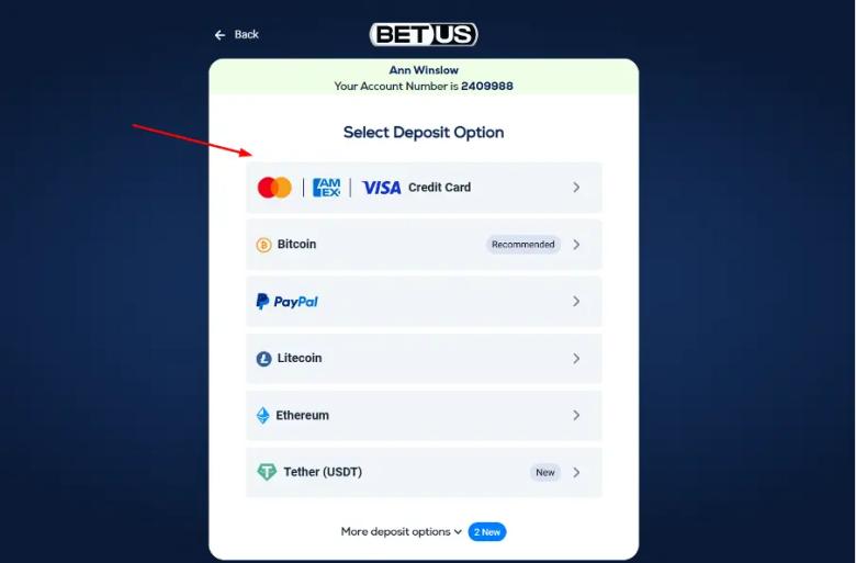 例えばBetUSカジノでクレジットカードを使って入金する際の手順をステップバイステップでご説明します。このプロセスは簡単で、クレジットカードでの支払いを受け付けている他のオンラインカジノでも同様の手順となります。