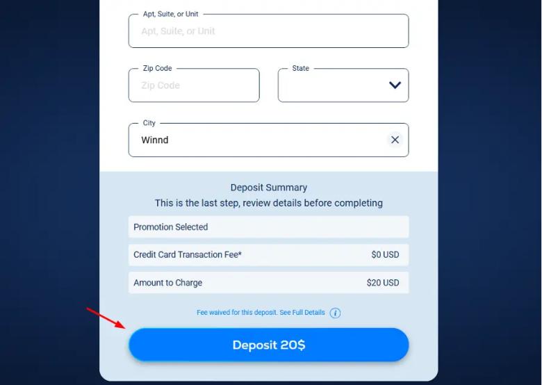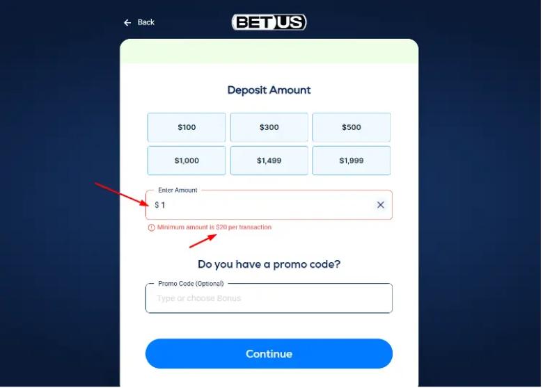 入金限度額の範囲内で入金金額を入力します(通常は20ドルから20円まで)。プロモーションコードをお持ちの場合は、この段階で適用できます。