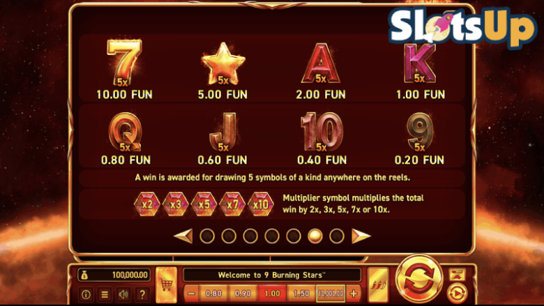 あなたはオンラインスロットで何が一番印象的ですか?もしそれがグラフィックや一般的なゲームプレイなら、9 Burning Starsは魅力的でしょう。グリッド上には9つのポジションがあり、それぞれ独立してスピンします。このゲームでは、少なくとも5つの同じシンボルがグリッド上のどこにでも見えるようにスピンすることで勝利となります。特に3x3のゲームでは、かなりユニークなシナリオです。リアルマネーを使用する前に、デモモードで9 Burning Starsをプレイすることをお勧めします。どちらの場合も、あなたのバンクロールに適したベットを選択する必要があります。スロットインターフェースの下部には、1スピン$0.20から始まる幅広いベット額が表示されています。最大ベット額は1スピン$10,000です。また、オートプレイ機能の上にあるボタンで、リールスピンのスピードを選択できることも注目すべき点です。