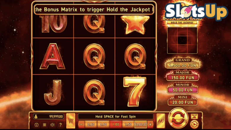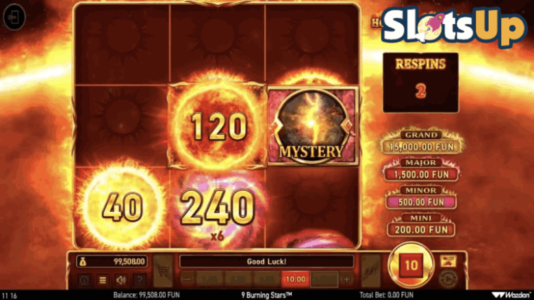 9 Burning Starsをプレイすると、リールに追加のシンボルが現れます。これらは数字が描かれた燃える太陽です。この数字は、ゲーム画面の右上にあるボーナスマトリックスに保存されます。このマトリクスが埋まると、ジャックポットボーナスラウンドがスタートします。保存されたすべての太陽のシンボルは1つの値に累積され、このフィーチャー中に中央のリールに表示されます。また、ミニ、マイナー、メジャーのジャックポットシンボルも同様に出現します。これらも対応するジャックポットをあなたに与えます。このラウンド中、ミステリーシンボルは他のボーナスシンボルにも変身します。ジャックポットミステリーシンボルは3つのジャックポットシンボルの1つに変化します。全てのポジションが埋まるか、リスピンカウンターがゼロになると、このラウンドは終了となります。ボーナスシンボルで9つのポジションをすべてカバーすると、ベット額の1,500倍のグランドジャックポットを獲得できます。