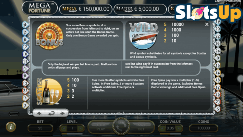 Wild symbol: The wild in this game is the luxurious yacht. It can be used to substitute other paying symbols in Megs Fortune. During the game, the Wild symbol appears anywhere on the reels. It will pay up to 5x your stake.